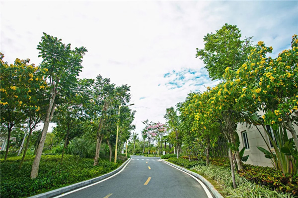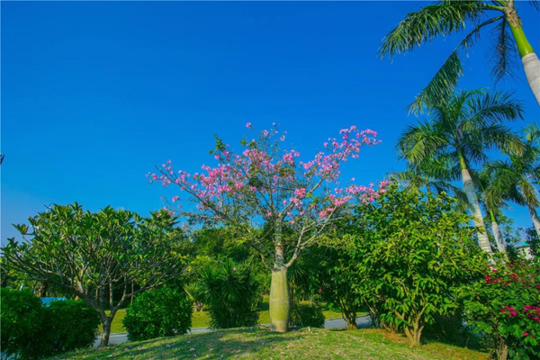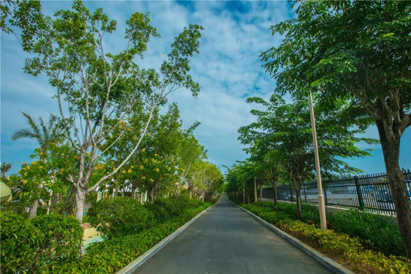 由于本项目地处近海,土壤为盐碱度较高的砂性土壤,为保证苗木成活率以及苗木种植后的恢复效果,园区内种植的苗木品种多选用热带植物品种,如棕榈科的海南椰子、银海枣、槟榔树、老人葵等,开花植物有红花木棉、黄槐、洋紫荆等。
