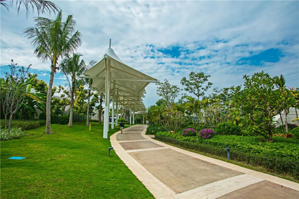 本工程主要以棕榈科为主搭配热带特色的常绿乔木及灌木少数落叶乔木建造的一道热带景观,属于海南式的热带园林景观,让人不管从哪个角度都看到不一样的风景。