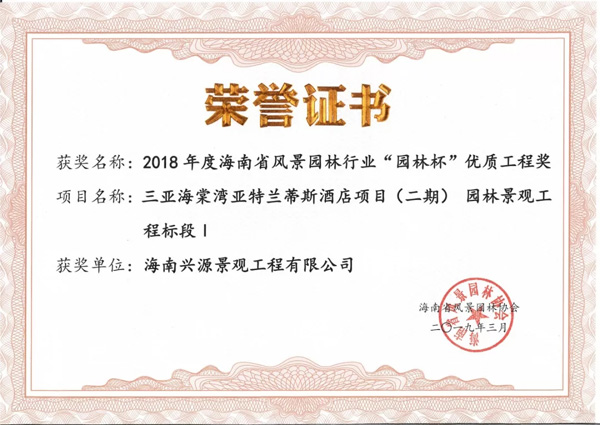 近日,由我司施工的“三亚海棠湾亚特兰蒂斯酒店项目(二期) 园林景观工程标段Ⅰ”项目被海南省风景园林协会评选为2018年度“园林杯”优质工程奖。该工程位于三亚海棠湾旅游区,主要是园建及绿化种植工程。“园林杯”是绿化行业在工程质量方面的最高荣誉,获得此项殊荣,不仅对我司及合作单位工作成果予以肯定,更是为我司在绿化景观建设行业奠定了基础。