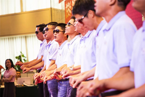 值得一提的是,大合唱节目表演儋州调声《祝姑九点半》,表演员工们戴墨镜,手挽手,在指挥员的指挥下,动作整齐划一,将整场庆典节目表演推向高潮。